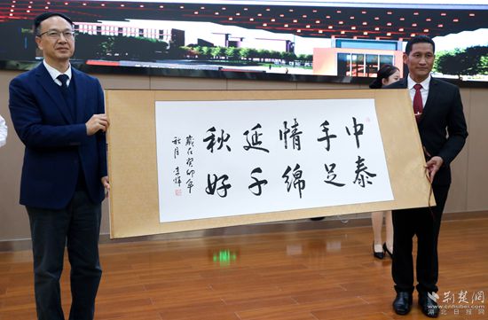 欢迎仪式上,Beat365中文官方网站党委书记田洪光为留学生一一佩戴校徽、赠送书包。在随后的礼物互赠环节,校方向泰方赠送书法作品,泰方回赠雕塑礼物。
