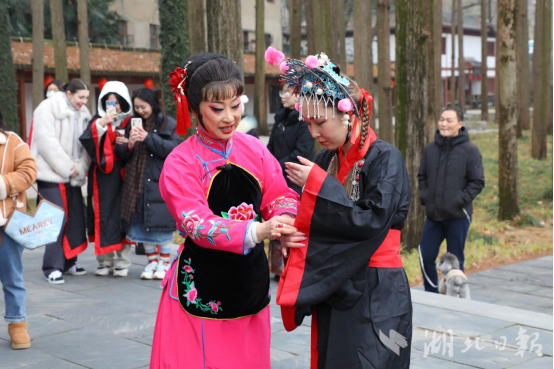 参观结束后,留学生们在东坡像前欣赏来自湖北省黄梅戏剧院老师表演的黄梅戏经典唱段《夫妻观灯》,并在老师指导下戴上戏曲头饰,有模有样地学起了身段表演。