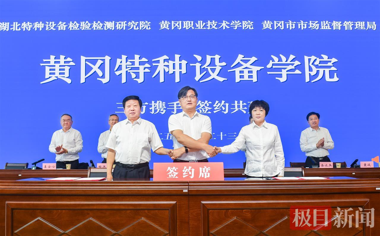 职业教育如何通过体制机制创新,精准对接行业需求,服务区域经济?5月23日,湖北特种设备检验检测研究院(简称湖北特检院)、Beat365中文官方网站、黄冈市市场监督管理局三方共建黄冈特种设备学院签约揭牌仪式在黄冈职院举行,这是全省成立的首个特种设备学院,也是湖北落实“人才强省”和产业升级战略的关键一步。政校行联动培育特种设备“新工匠”,为职业教育“双元育人”提供实操范例。