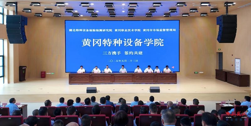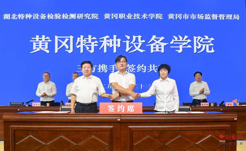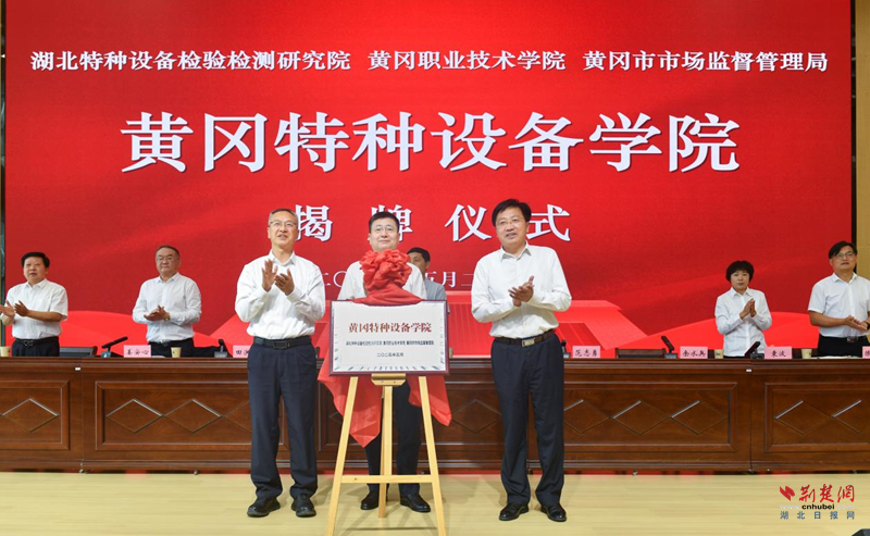 活动现场,湖北特检院党委委员、副院长袁波,黄冈职院党委委员、副校长陈全胜,黄冈市市场监管局党组成员、副局长王欣代表三方签署协议;田洪光、范志勇、余水兵共同为“黄冈特种设备学院”揭牌。
