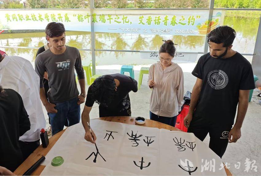 包粽子余兴未消,留学生们又迎来书法初体验。生物与农业学院党总支副书记田涛手持毛笔,从“悬腕执笔”开始为同学们细致讲解。“端午之忆!”留学生们在宣纸上一笔一画写下祝福,虽线条稚拙却满含诚意。