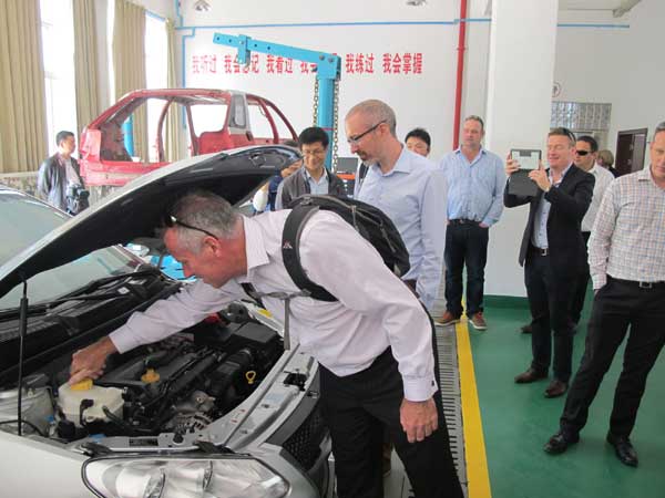 新西兰教育专家察看学生检测保养过的汽车质量情况