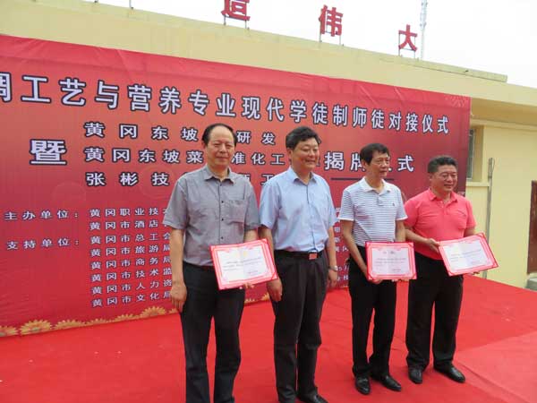 在活动现场,中国黄冈东坡菜标准化工作室、中国黄冈东坡菜研发中心、中国烹饪大师(张彬)创新工作室同时揭牌,工作室设在黄冈职院商学院,由中国烹饪协会副会长、中国烹饪大师卢永良和中国烹饪大师孙昌弼、张彬三位东坡菜名家共同指导。