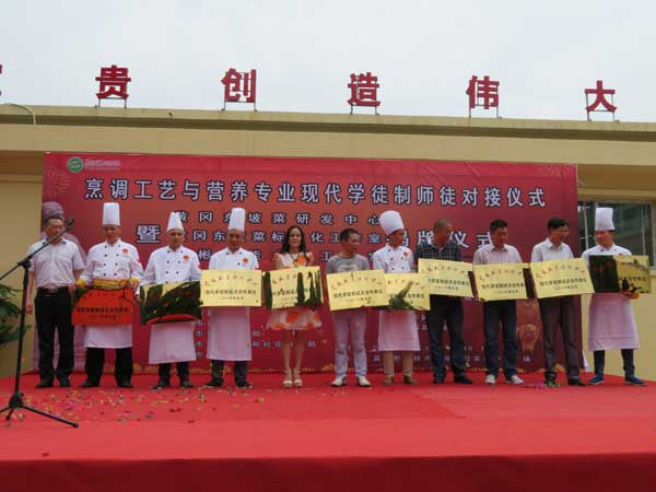黄冈职院校长姜安心聘任张彬等10位行政总厨担任黄冈职院现代师徒制试点合作大师级师傅。吴远征 摄