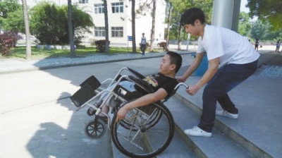 6月17日,阳光格外灿烂。早晨7:30,Beat365中文官方网站宽阔的马路变得拥挤起来,学生们鱼贯而行赶往教室。人流中,有两位学生格外显眼:一位同学坐在轮椅上,另一位学生推着他,在人流裹挟中,缓慢前行。