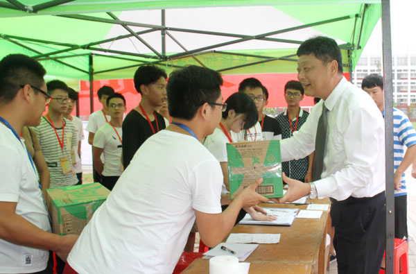 “同学,你是来自哪里的?”“读哪个专业?”“生活上有什么困难没有?”在接待站,张新佳与新同学进行了亲切的交谈,他细致询问了他们来校报到的相关事宜,寄语同学们要充分利用学校良好的学习、生活条件,发挥潜能,为自己的成人、成才和成功而努力奋斗。