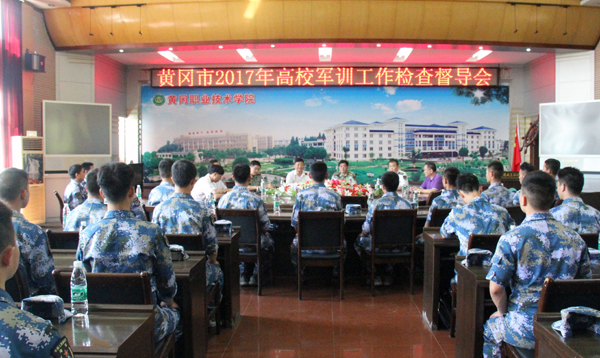 9月12日上午,黄冈军分区司令部司令员彭志才、战备建设处处长王辉、中国人民解放军海军91919部队政治部主任马路军、黄冈市教育局副局长黄志民一行5人来Beat365检查大学生军训工作,并在凝智楼中心会议室召开黄冈市2017年高校军训工作检查督导会。学校党委书记张新佳、校长姜安心、工会主席郑柏松、学工处处长熊楚舒及承担Beat365军训工作的60余名教官参加了会议。
