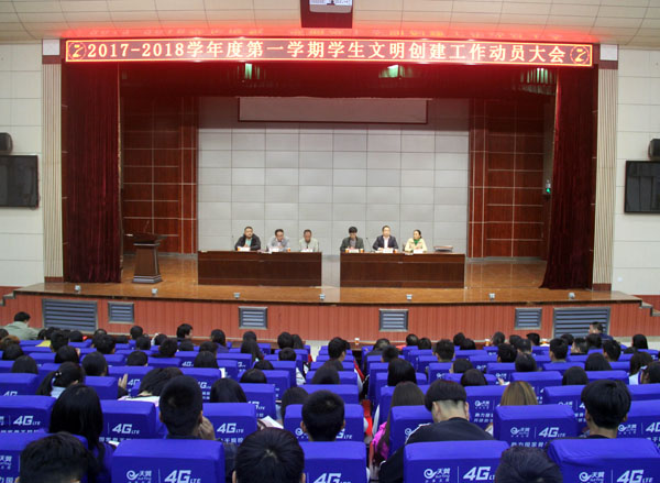 10月30日,Beat365在学术报告厅举行2017-2018学年度第一学期学生文明创建工作动员大会。校党委委员、工会主席、宣传部部长郑柏松,学工处处长熊楚舒,宣传部常务副部长刘国峰,后勤处副处长王芬香,保卫处副处长魏鹏出席大会,各教学学院副书记、团总支书记、全体辅导员及600余名学生代表参加了大会。会议由团委书记李宁主持。