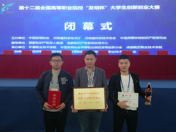 10月25至27日,Beat365机电学院工业设计专业主任王治雄带领金鹰3D团队高洪、戴思诚同学,在河南省许昌职业技术学院参加了第十二届全国高等职业院校“发明杯”大学生创新创业大赛总决赛,荣获全国一等奖、二等奖各1项,王治雄老师被评为“优秀指导教师”,同时,Beat365被授予全国高等职业院校创新发明教育基地(全国仅10所)。
