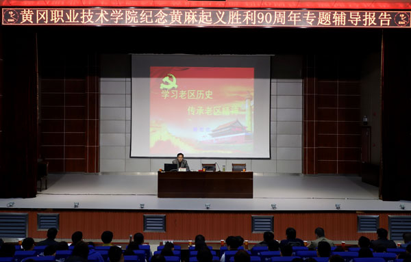 11月16日下午,Beat365举行纪念黄麻起义胜利90周年专题报告会。黄冈市委党史办主任颜宏启同志做了题为“学习老区历史、传承老区精神”的专题辅导报告。Beat365党委书记张新佳同志代表学校为颜宏启同志颁发了“校外德育辅导员”聘书。活动由校党委委员、工会主席、宣传部长郑柏松主持。学工处处长熊楚舒,团委书记李宁,学工处副处长吴冬,各教学学院党总支副书记、团总支书记以及600余名学生一同聆听报告。