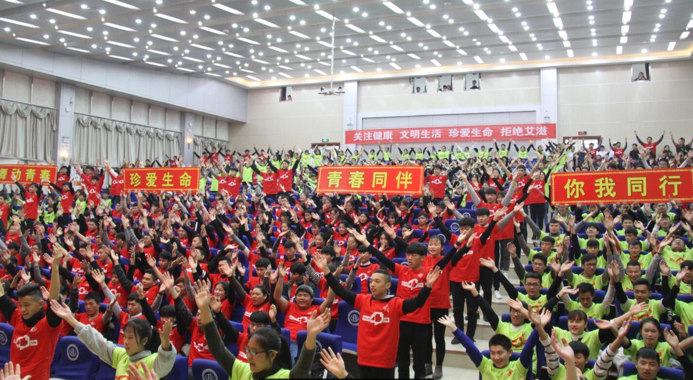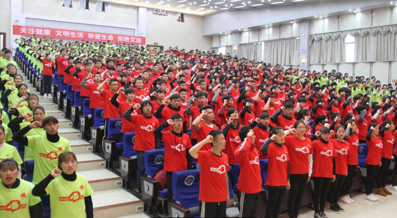 在激情澎湃的“生命之舞”音乐声中,全场800余名学生迅速舞动起来,青春的节拍,健康的跳动,整个现场似燃烧的青春,火热的激情点亮了每个学生对未来美好生活的向往。学生代表胡萌萌向全体同学发出《共担防艾责任,共享健康权利,共建健康中国》的倡议书,全体同学集体宣誓,铿锵有力的誓言,体现了当代大学生的担当责任和时代使命。