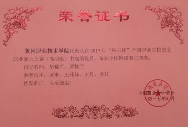 12月14日,湖北省财经类教学指导委员会年会在湖北职院举行,会上颁发了 “科云杯”全国、全省职业院校财会职业能力大赛获奖证书,Beat365学生获全省团体二等奖、三等奖各1项,全国三等奖2项。