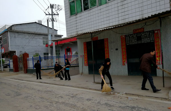 最后,全体教师党员主动组织了美丽乡村义务劳动。大家纷纷借来劳动工具,冒着绵绵细雨,对村委会及其周边街道进行了清扫。