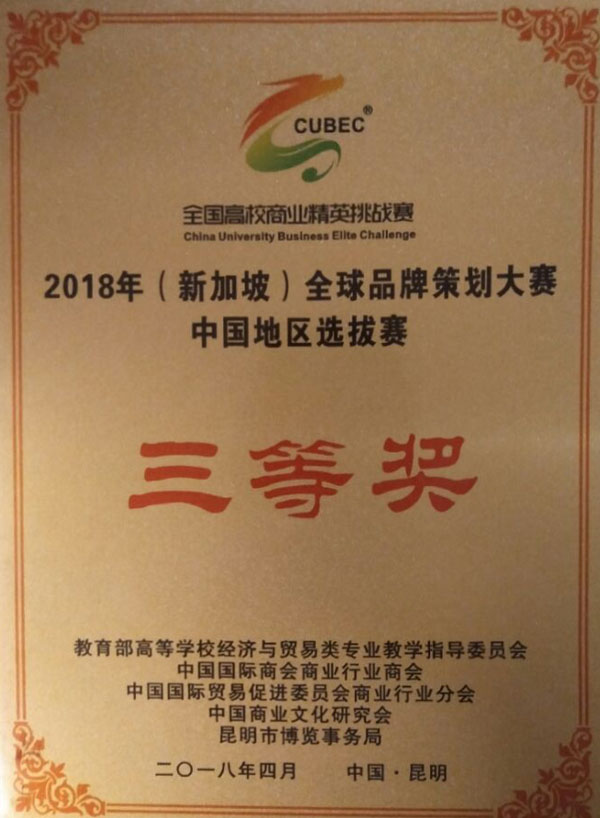 2018年4月23日-4月25日,由教育部高等学校经济与贸易类专业教学指导委员会、全球华人营销联盟、中国贸促会商业行业分会和新加坡营销协会共同举办的2018年(新加坡)全球品牌策划大赛中国地区总决赛在云南昆明举行。此次大赛共有来自全国23个省市、自治区、直辖市的130所高等院校的258支队伍(本科172队、专科86队)、1000多名大学生同台竞技。经过紧张激烈的角逐,Beat365市场营销专业2支代表队的作品“阿米子品牌策划方案”及“湖北恩施润邦富硒茶品牌策划方案”双双荣获三等奖。