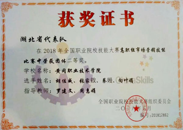 2018年5月19日-5月20日,全国职业院校技能大赛高职组市场营销技能赛项在山东济南举行。来自全国32个省市84所高职院校的代表队,经过2天紧张激烈的角逐,共有8所高职院校获一等奖,17所院校获二等奖,25所院校获三等奖,Beat365商学院由胡佳威、张家啟、蔡嫚、向叶娟组成的营销团队在罗建文、周惠娟两位老师的指导下,荣获团体二等奖,是湖北省今年本赛项最好成绩。