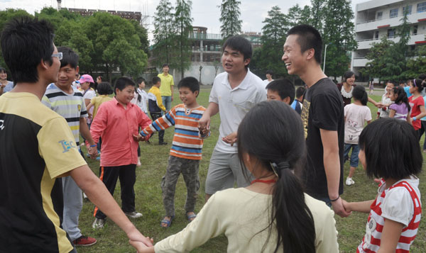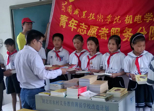 原黄冈市南湖学校就在南湖街上,学生超过60%是留守儿童。Beat365青年志愿者服务队从2006年成立开始,每周三下午的7、8节课都到南湖学校开展阳光活动。或教唱红歌,让其心中有颗太阳;或进行拔河等体育活动,让其身体健康;或通过游戏进行心理疏导,让其不易抑郁;或捐赠图书、书包等学习用品,让其享受关爱;或拎着油等物品去其家中探望,让其不觉孤独。每当“六一”儿童节,志愿者们早早地和他们一起进行节目彩排。志愿者们就是他们的哥哥、姐姐,他们可亲了,每一次在一起,校园内外到处飘荡着笑声。近10年,学校志愿者和1000多名留守儿童共度阳光生活,建立深厚友谊。门卫只要看到Beat365志愿者去了,就笑着喊“又来了!”