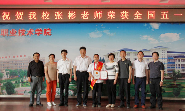 杨艳红为张彬颁发“全国五一劳动奖章”荣誉证书并与参加活动的领导老师合影