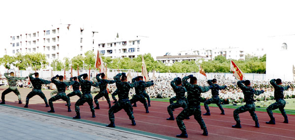 9月11日上午,学校2018级新生军训动员大会在中区田径运动场隆重举行。中国人民武装警察部队黄冈支队队长陈建林、副参谋长王小彬,学校校长姜安心,工会主席、宣传部部长郑柏松,各处室负责人,各学院党总支书记、院长及全体新生参加了此次动员大会。