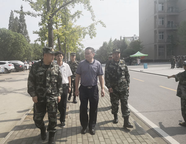 9月13日下午,中国人民武装警察部队湖北省总队训练处处长许荣华、武警黄冈支队队长陈建林等一行4人来Beat365督查大学生军训工作。在校长姜安心,工会主席、宣传部长郑柏松,军训团团长、武警黄冈支队副参谋长王小彬陪同下深入各教学学院军训现场,察看了军训训练情况。