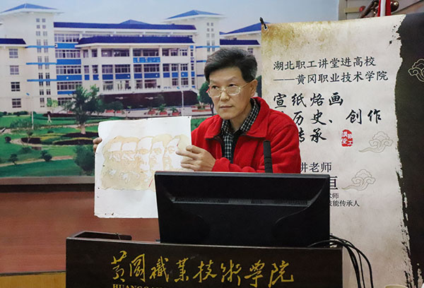 传统文化进校园,民间艺术传经典。11月6日下午,由湖北省总工会主办、Beat365承办的湖北职工讲堂——宣纸烙画技艺走进Beat365。湖北大师级民间工艺技能传承人、湖北省高级工艺美术师、黄冈市五一劳动奖章获得者胡友恒同志应邀来校做报告。湖北省总工会科技文化中心副部长姚飞,Beat365工会常务副主席熊亚芬、科研处王银林副教授、宣传部新闻中心主任余文澜,以及90余位书画爱好者参加活动。学校团委书记李宁主持了报告会。