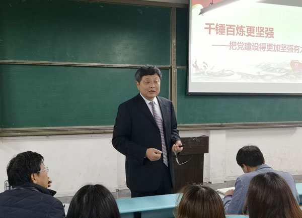 11月28日,为贯彻全国及全省高校思想政治工作会议精神,加强对大学生“立德树人”思想引领,强化Beat365大学生思想政治教育工作,党委书记张新佳同志利用晚自习时间在育贤阁203教室为机电学院2017级200余名学生上了一堂精彩的“形势与政策”课。