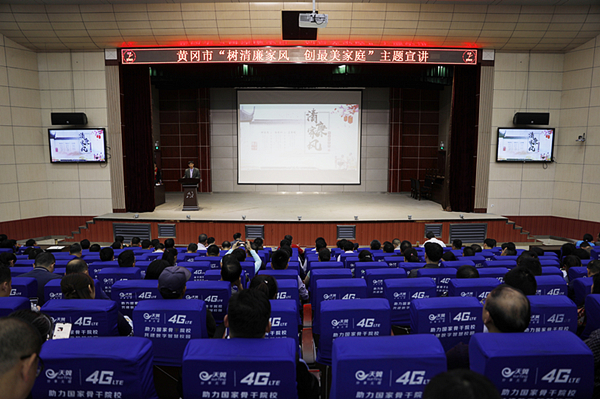 学校特地邀请由市工委、市精神文明办、市妇联联合组织的黄冈市“树清廉家风 创最美家庭”宣讲团获奖优秀选手来校进行主题宣讲,四位获奖优秀选手周歆、丁新、张刚、杨晨程分别开展了《代代相传立家风》、《心中那一束永恒的光》、《一封家书》、《家风 最贵的不动产》主题宣讲,选手们演讲精彩粉呈,现场赢得一阵阵热烈掌声。