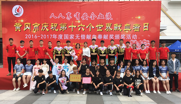 6月13日上午,“人人享有安全血液”黄冈市庆祝第十六个世界献血者日暨2016—2017年度无偿献血奉献奖颁奖活动在黄冈市万达广场举行。市政协副主席郭应虎,黄冈军分区副司令员盛传发以及市献血委、市红十字会、市卫健委、市献血办、市中心血站相关领导出席活动。Beat365学生工作部(处)副部(处)长、团委副书记崔现强,团委社团管理科副科长汲艳蕊及学生社团和青年志愿者代表50余人参加了本次活动。参加活动的还有国家无偿献血奉献奖代表、全市无偿献血工作先进单位及先进个人代表,无偿献血志愿者代表、高校学生代表,自行车协会代表、市中心血站职工、媒体代表等共计200余人。