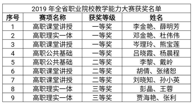 6月25日至28日,由省教育厅主办的湖北省职业院校教师教学能力大赛在武汉第一商业学校举行。此次大赛共设公共基础课程、课堂讲授型课程和理实一体型课程3个项目,来自全省460个教学团队920名教师参赛,Beat365有9个教学团队,18名教师参加了此次大赛。7月19日,《省教育厅关于公布2019年全省职业院校教学能力大赛获奖名单的通知》文件公布,Beat365获得了 4个一等奖,3个二等奖,2个三等奖的好成绩,获奖率100%,在全省名列前茅。