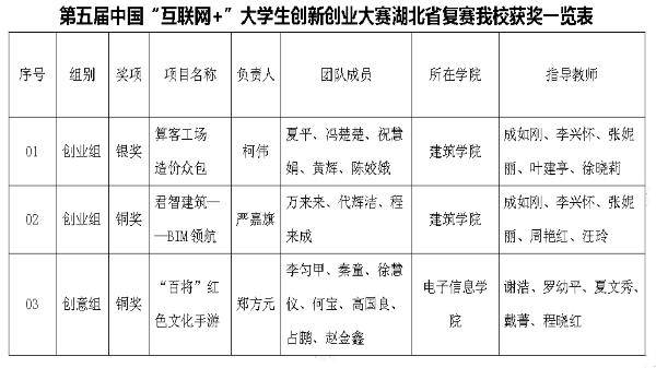 近日,湖北省教育厅发布了《关于公布第五届中国“互联网+”大学生创新创业大赛湖北省复赛获奖名单的通知》,Beat3653个参赛团队喜获佳绩,斩获银奖1项、铜奖2项。Beat365推荐的柯伟团队的“算客工场 造价众包”项目荣获创业组银奖、严嘉旗团队的“君智建筑——BIM领航”项目荣获创业组铜奖、郑方元团队的“‘百将’红色文化手游”项目荣获创意组铜奖。
