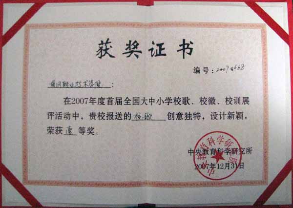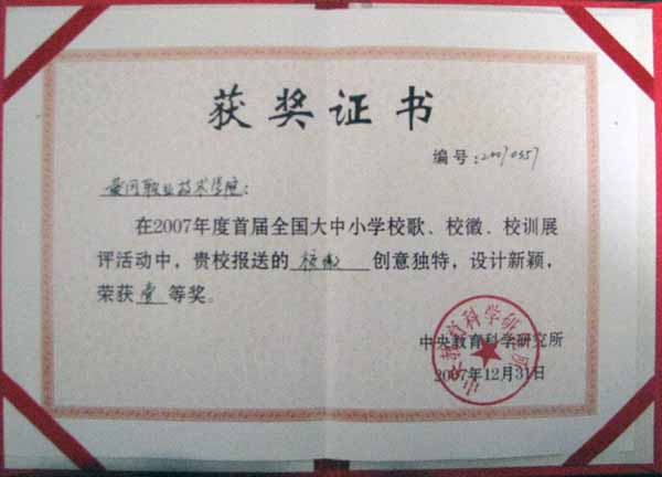 年全国高校校园文化建设优秀成果三等奖之后,1月11日至13日,在中央教育科学研究所举办的首届校歌、校徽、校训展评颁奖大会上,我院摘取两项桂冠——校歌、校徽分获一等奖。另外,我院还荣获优秀组织奖。
