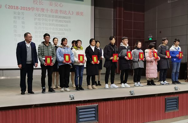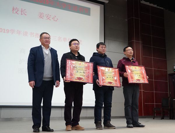 姜安心为宋金芳等十名读书达人和2018-2019年度读书指数团体前三名的商学院、护理学院、医药学院颁奖,刘东山先后为读书节活动“奔跑吧·同学”团体前三名的团队、为荣获大学生读书节优秀组织奖的医药学院、护理学院和交通学院学院颁奖,与会领导分别为其他各项读书活动优胜者颁奖,活动中,时海洋同学还现场再现了在第二届湖北省高职院校微视频朗诵大赛总决赛上的微视频作品《老人与海》。