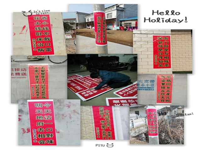 大年初一,为了不让村民们走亲、访友、拜年、串门,徐杰带领村委会成员进行部署,连夜制作、张贴硬核标语。为了防止疫情传播,他们迅速封路、堵路,在主干道设立劝导岗,制作、张贴劝导标语。