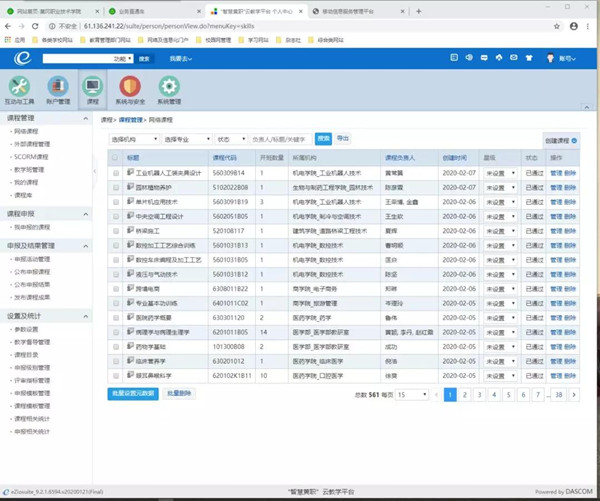 2月2日,学校印发《学校疫情防控期间教学工作总体实施方案》,并下发通知。全校教师紧急行动,在原申报的300余门线上课程的基础上,新申报课程200余门,至2月10日,在线开放课程数据达561门,上传各类资源10万余条,每门课程都达到线上教学标准。线上教学平台访问量900余万人次。