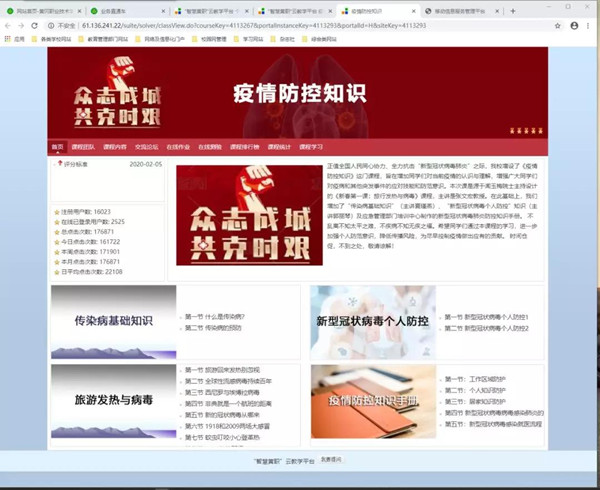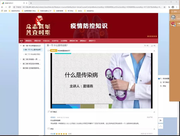 为配合疫情防控,普及疫情防控知识,学校开设新年第一课:《疫情防控知识》,自制教学资源6套,收录资源30余学时(含旅游发热与病毒、新型冠状病毒个人防控等视频资源和疫情防控知识手册等文本资源),开设教学班级149个,组织150余名教师开展线上教学,为近16000余名学生提供在线学习环境。