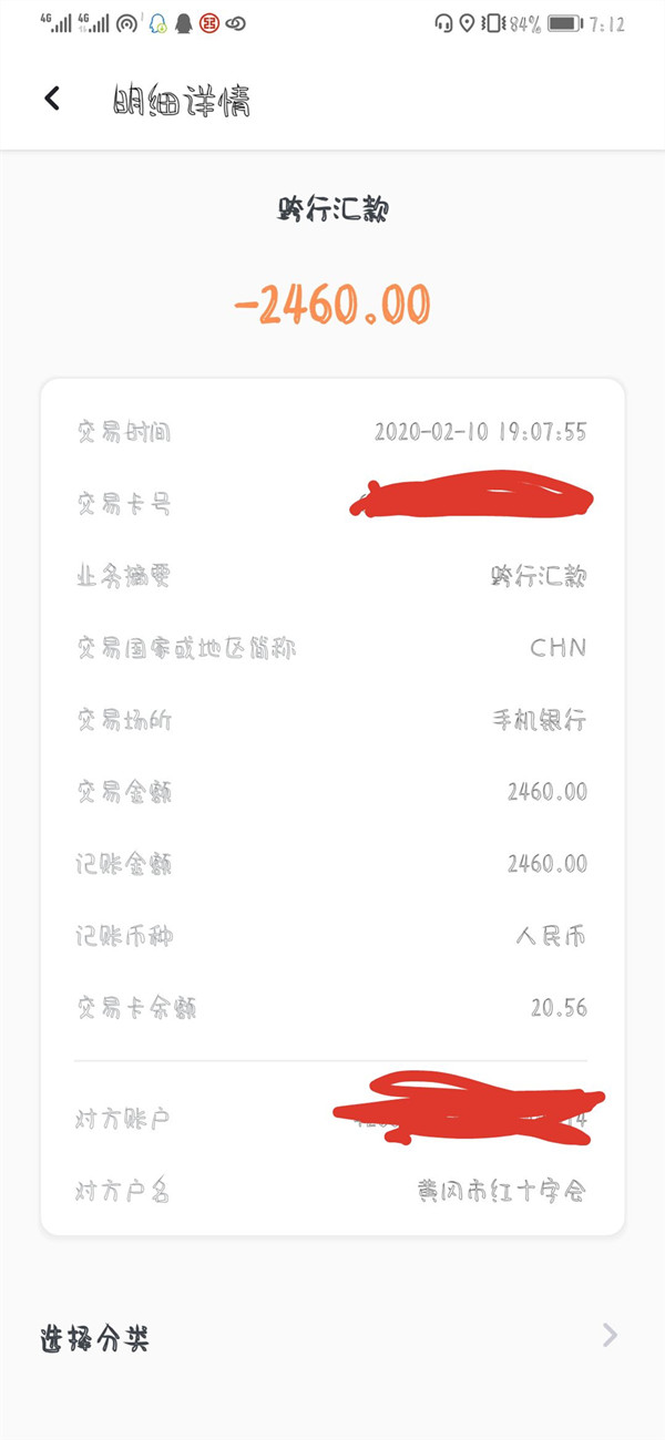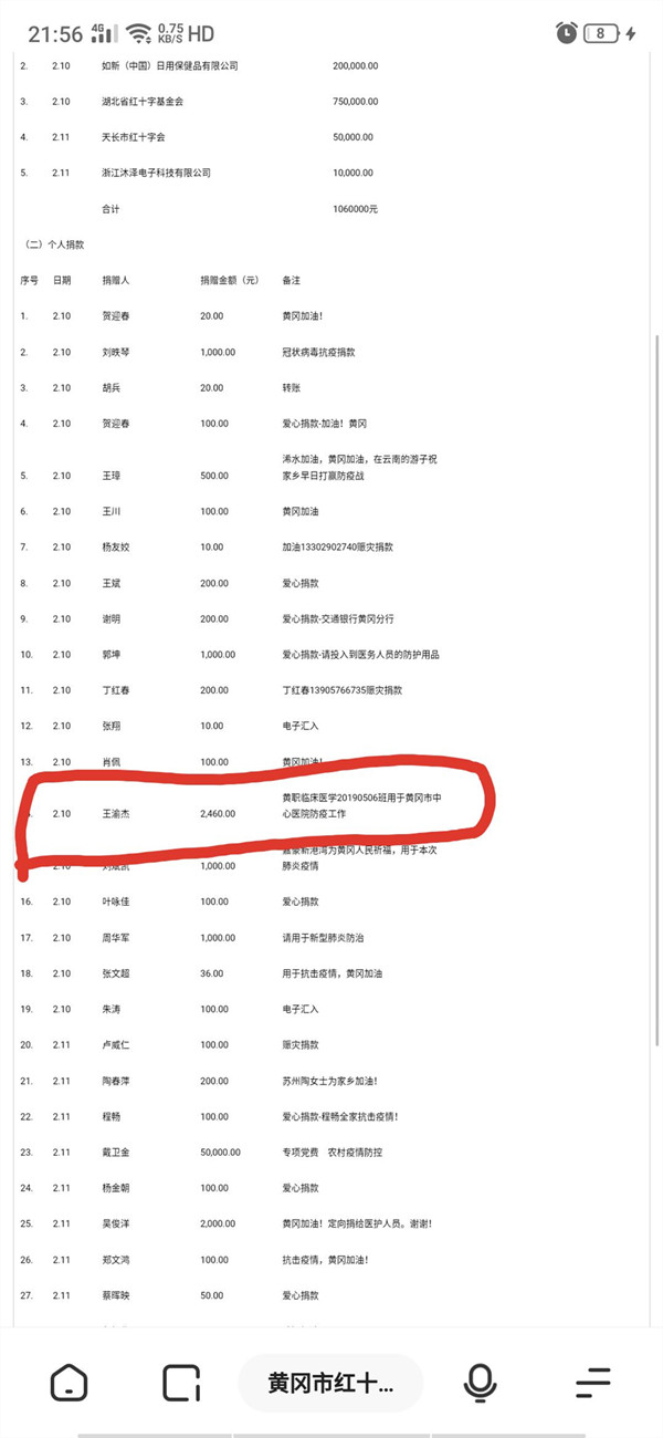 于是2月8日,班干部提出倡议并组织同学们积极为灾区捐款,采取自愿原则进行。同学们的每一笔捐款都在班级群内公示,许多同学都积极献出爱心10元、20元、50元,甚至100元、200元,捐款金额共计2460元。募捐结束后班级负责人第一时间将其交给黄冈市红十字会,用于黄冈中心医院新冠肺炎防疫工作。