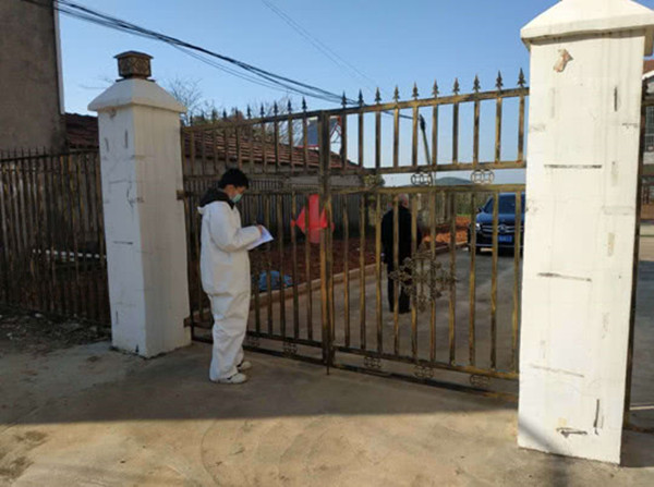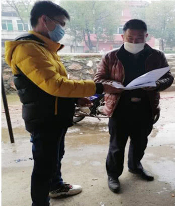 丁磊挨家挨户给村民量体温并记录