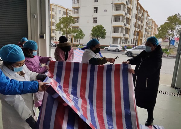 老师们(右一为姚芸)齐心协力裁剪彩条布