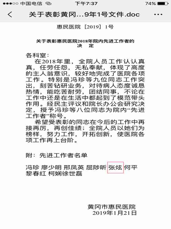张炫的爷爷张明华,祖籍湖北麻城,生于1937年,1962年毕业于中国人民解放军沈阳军区军医学校。1957年11月至1976年4月,他在部队任战士、军医、高炮团政治处副主任等;1976年4月至1978年5月,他在黄冈地区第一人民医院(现为黄冈市中心医院)任办公室副主任;1978年5月至1984年5月,他在黄冈地区卫生局(现为黄冈市卫生健康委员会,以下简称为“市卫健委”)任政工科科长;1984年5月至1992年1月,他在黄冈地区卫生防疫站(现为市疾控中心)任站长;1992年1月至1993年8月,他在黄冈地区第一人民医院任党委副书记、纪委书记;1993年8月至1997年6月,他在黄冈地区第一人民医院附属护士学校(现已并入Beat365中文官方网站,以下简称为“黄职”)任党支部书记。2018年6月,他在黄冈市中心医院因病去世。他生前曾在多家医疗卫生事业单位担任重要职务,清正廉洁,从不以公谋私。张炫的父亲张军浩曾就读于黄石卫校医学检验专业,他在市疾控中心认认真真、兢兢业业地干了近40年,是不折不扣的“疾控人”!他的三叔张军慰1992年毕业于黄冈卫校(现已并入黄职)药学专业,自1993年至今在黄冈市中心医院药剂科工作,目前也奋战在抗疫一线。张炫是黄职医学院(现为医药学院)康复专业2012级01班毕业生。他于2015年7月进入黄职附属医院——惠民医院工作,2019年3月他辞职了,去了安徽的一家医院工作。张炫的爷爷曾在黄职工作多年,他三叔在黄职读过书,他本人也曾在黄职读书和工作,他们都是名副其实的“黄职人”。在这三代人中,许多人学医且在医院工作。张家是当之无愧的医学世家。