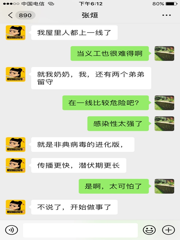 与张炫一起做志愿活动的王尧老师说:“张炫很独立,很坚强,自从工作了就没问家里要过一分钱,他凭借自己的努力,闯出了自己的一片天;他身上有满满的正能量,不仅积极参加志愿者活动,而且主动上一线四处消杀;他很有出息,父亲走了,他尽管万分悲痛,但还是勇敢地上一线战斗。这样的年轻人现在真的不多了!”疫情暴发以来,作为党员的王老师在小区参与劝导、宣传、值勤、生活用品采购及递送等志愿服务工作;他也连续三天参加了将黄职的1217间学生宿舍改建为新冠肺炎密切接触者隔离观测点(以下简称为“留观点”)的“战斗”;作为留观点代购组的工作人员,他每天忙于采购各种物资……为了抗疫,王老师每天都忙得不可开交,他却谦虚地说:“和张炫相比,我们做的真的不算什么。”