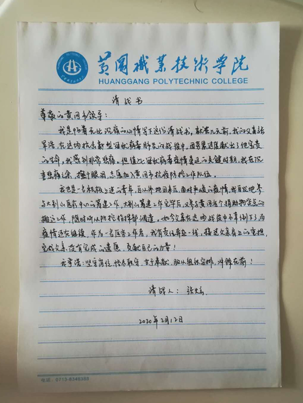 2月12日,张炫“怀着无比沉痛的心情”写下了《请战书》,并将其递交到市疾控中心,《请战书》中写道“值此冠状病毒疫情蔓延的关键时期,我在沉重悲痛之余,擦干眼泪,志愿加入黄冈市抗疫防控工作队伍”。