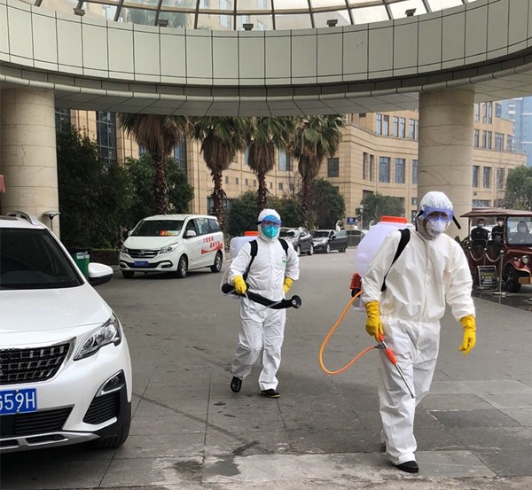 2月16日,张炫与队员们对6个疫点进行消毒;在黄职对走廊、楼梯间及一楼大厅进行消毒;在税务宾馆对所有客房、厨房、餐厅、走廊、楼梯间、一楼大厅进行消毒。