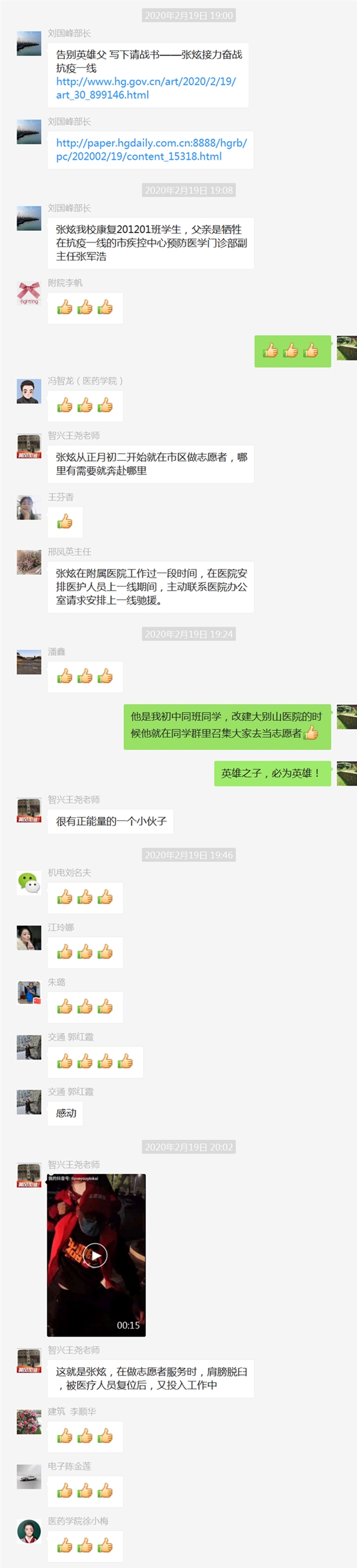 张炫的抗疫事迹在黄职教职工微信群里引起了轰动