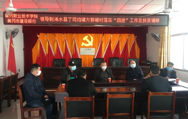 3月18日,校长助理、两办主任刘明涛会同建设银行黄冈分行副行长徐文平,带领两个单位相关部门负责人一行7人到浠水县丁司垱镇方郭铺村落实“四进”工作任务,了解疫情防控、春耕生产和农户外出务工等情况,指导落实近期工作任务,部署2020年扶贫攻坚工作。