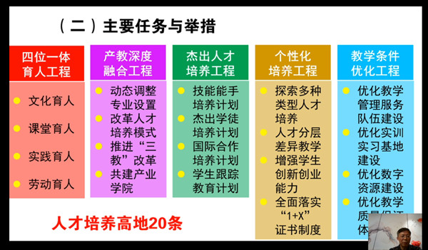 熊发涯教授从打造技术技能人才培养高地的内涵与要求、任务与举措、机遇与挑战、应对与展望四个方面,系统阐述了双高建设中人才培养高地建设的理念、目标及方法,黄职精神的内涵及在双高建设中的作用。他重点对学校“人才培养高地20条”(学校人才培养五大工程,20项子任务)进行了讲解说明。他为听课教师带来了一场紧跟时代前沿、紧贴职教实践的知识盛宴。课后,熊发涯教授热情回答了听课网友提出的有关问题。