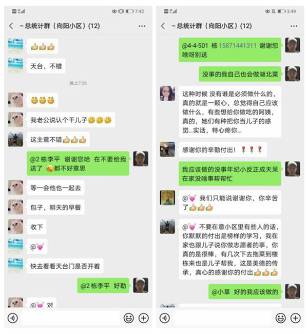 这两个月既短暂又漫长,他把对家人的爱都给了小区居民,同时也得到了居民们的关爱。小区里有一位老人,今年八十多岁,这位老人让他想起了家里的爷爷。没事的时候他就去找老人聊天,给老人按摩。老人每次都和他打招呼,还夸他是好人。这更坚定了他抗击疫情的信念:一定要为居民做好服务工作!