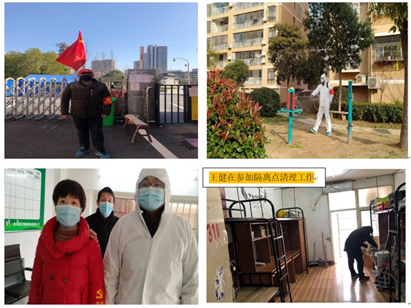 王健老师在防护物资极其紧张的时候,通过多种渠道和多种途径,联系到了一批救援物资,为小区捐赠医用手套4000只、医护帽1000个、隔离服15套。他积极参与小区消毒和门口岗亭的值守,对待工作一丝不苟。每一个单元门、电梯间、楼道、健身器材、垃圾桶、角落的消毒他都不放过。此外,他还参加党员包保工作,每天负责小区20户家庭、56位居民的健康监测,并在生活上为他们排忧解难。疫情严重时期,他积极参与“黄职留观点”学生宿舍腾退工作。王健老师舍己为人、乐于奉献的精神值得称赞。