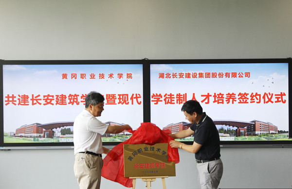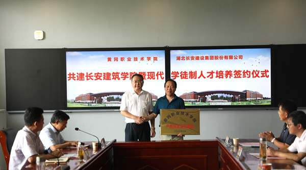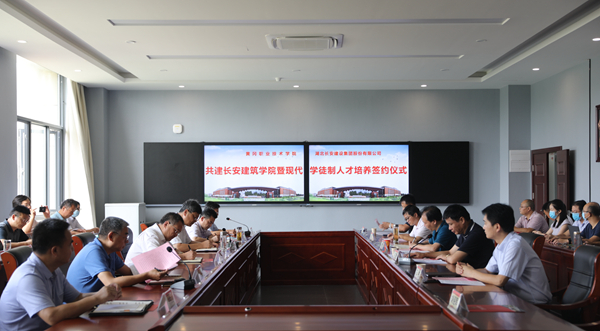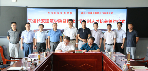 7月17日上午,Beat365中文官方网站(以下简称为“黄冈职院”)、湖北长安建设集团(以下简称为“长安集团”)共建长安建筑学院暨现代学徒制人才培养签约仪式在思贤阁1号楼1楼思政教育基地会议室举行。黄冈市教育局党委委员、黄冈市教育工会主席刘立志,黄冈市住房和城乡建设局党组成员、总工程师刘俊,长安集团董事长段卫昌、总经理叶发保、副总经理石柱、黄冈分公司经理余义锋等6人,校党委书记张新佳,校长姜安心,副校长熊发涯、刘东山,校长助理(两办主任)刘明涛,建筑学院班子成员、专业主任,校企合作处、教务处、招生工作处、就业指导处、职业教育研究院负责人,参加了签约仪式。仪式由熊发涯主持。