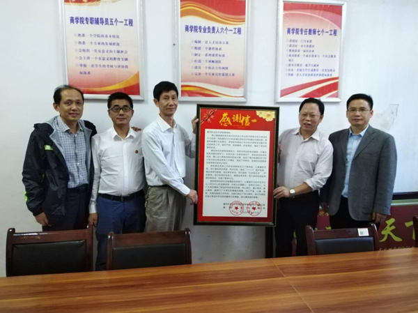 9月24日,黄冈市财政局党组成员、副局长陈宝林携黄冈市会计管理局副局长高东溟、科长陈国华,将一封滚烫的感谢信送到商学院。商学院院长周常青、副院长叶建亭、党总支副书记刘洋、办公室副主任刘喜咏在商学院会议室参加了感谢信接收仪式。