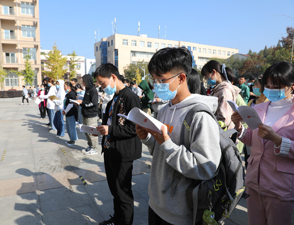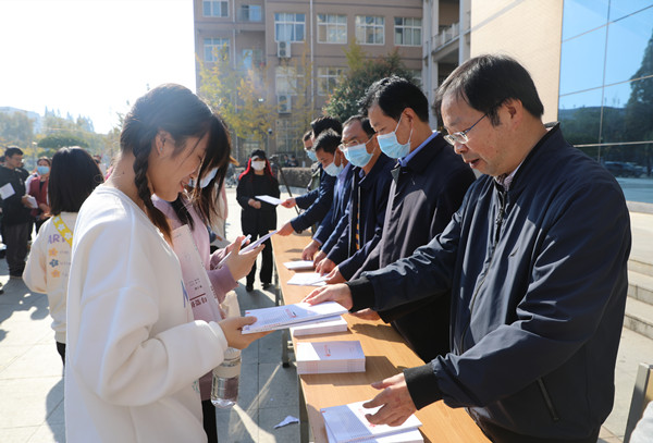 为贯彻落实“谁执法谁普法”普法责任制要求,加强审计普法宣传力度,提升在校师生的法律意识,11月13日上午,湖北省审计厅党组成员、省纪委监委派驻省审计厅纪检监察组组长张雪一行在学校汇贤阁门前的广场上开展了“送法进校园”活动。学校党委委员、工会主席、宣传部部长郑柏松,党委委员胡燕,教职工代表及学生代表共300余人参加了本次活动。
