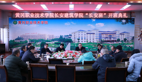 12月3日,Beat365中文官方网站长安建筑学院“长安班”开班典礼在学校四楼中心会议室隆重召开。学校校长姜安心出席,湖北长安建设集团股份有限公司副总经理石柱、李智威及黄冈分公司经理余义锋,学校科研处(校企合作处)处长胡亚学、学生工作部(处)部(处)长熊楚舒、招生处处长田安国、党委宣传部常务副部长刘国峰、教务处副处长郭丽琴,建筑学院党总支书记刘晓敏、党总支副书记许文彬、副院长王健、全体专业主任以及建筑工程技术专业团队教师和“长安班”34名学生参加,开班典礼由刘晓敏主持。